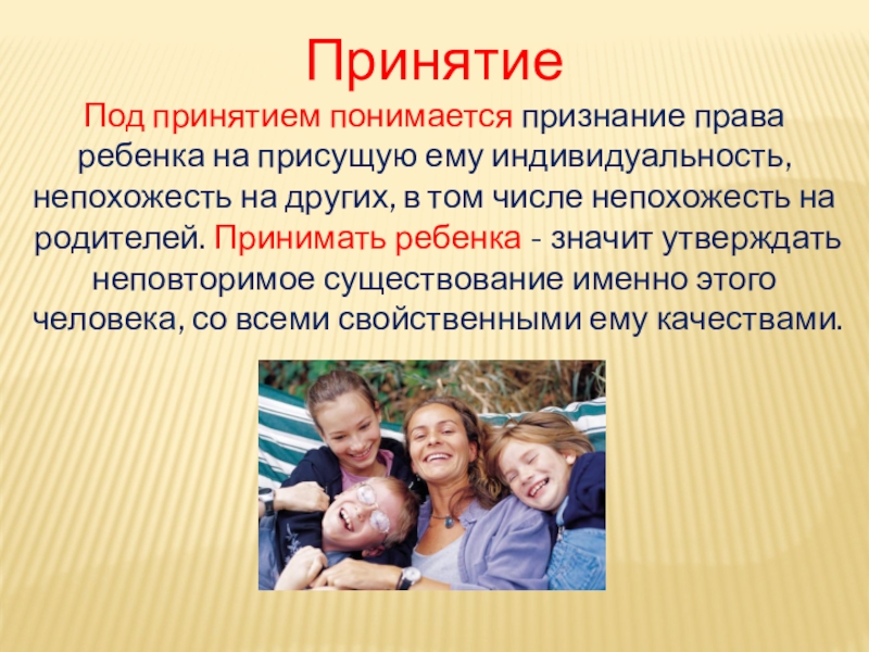 Под принятием понимается признание права ребенка на присущую ему индивидуальность, непохожесть
