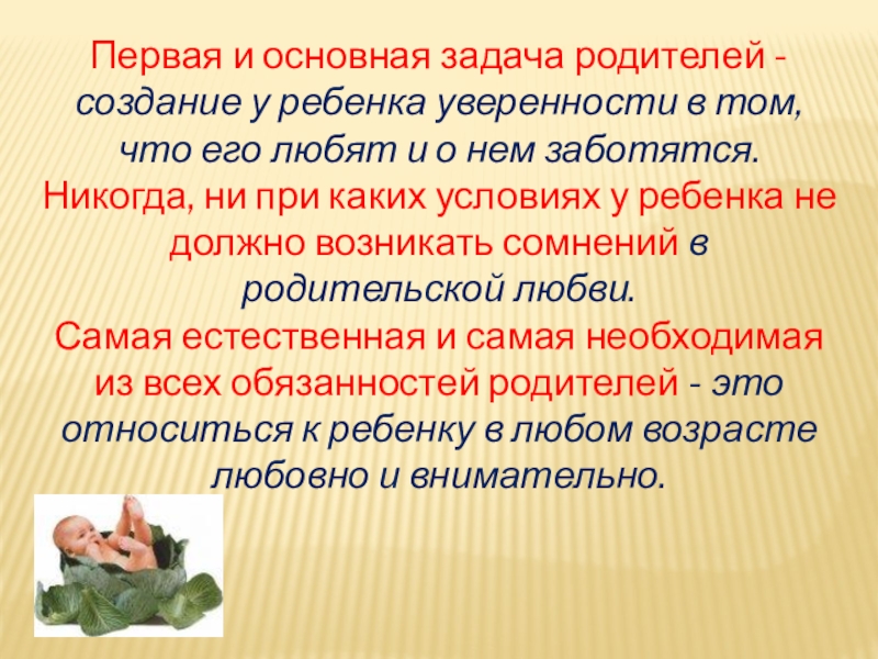 Слайд 8Первая и основная задача родителей - создание у ребенка уверенности в