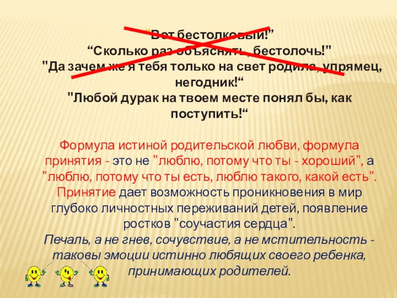Формула истиной родительской любви, формула принятия - это не "люблю, потому что ты - хороший", а "люблю, потому что ты есть, люблю такого, какой есть".
