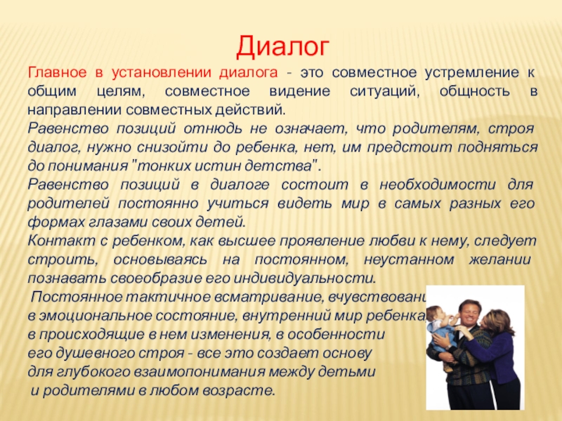 Равенство позиций в диалоге состоит в необходимости для родителей постоянно учиться видеть мир в самых разных его формах глазами своих детей.