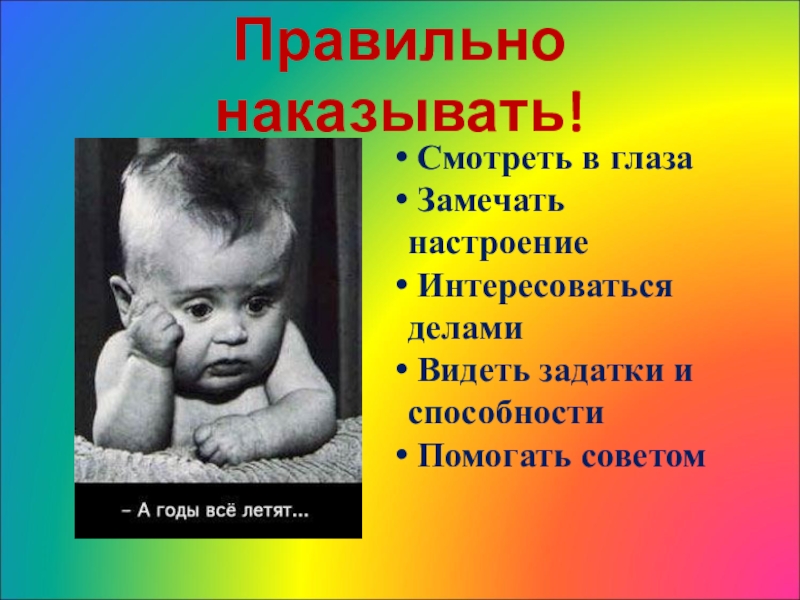 Правильно наказывать! Смотреть в глаза Замечать настроение Интересоваться делами Видеть задатки и способности Помогать советом