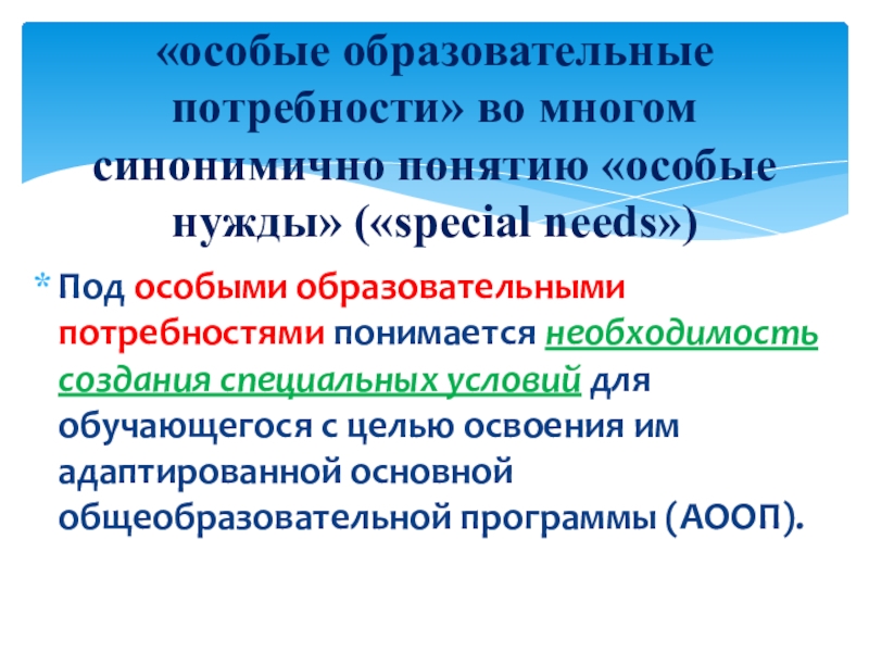 «особые образовательные потребности» во многом синонимично понятию «особые нужды» («special needs»)