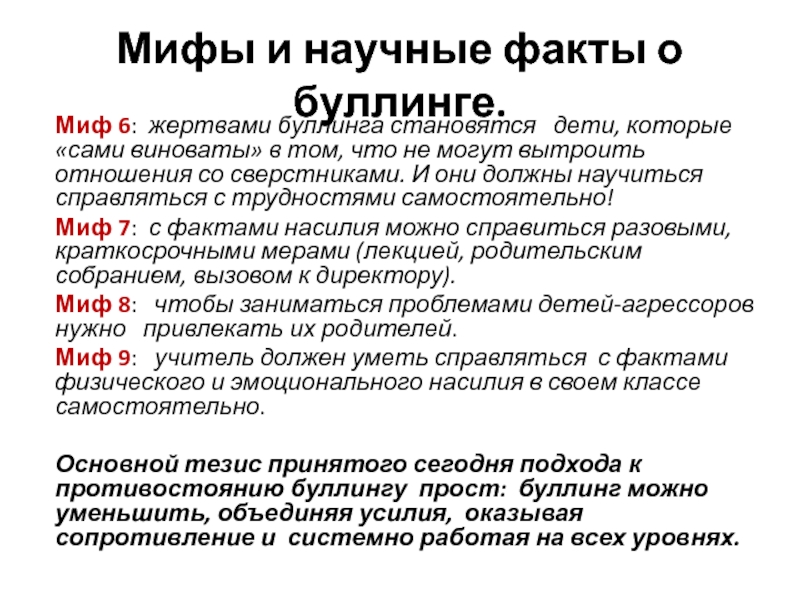 Основной тезис принятого сегодня подхода к противостоянию буллингу прост: буллинг можно уменьшить, объединяя усилия, оказывая сопротивление и системно работая на всех уровнях.