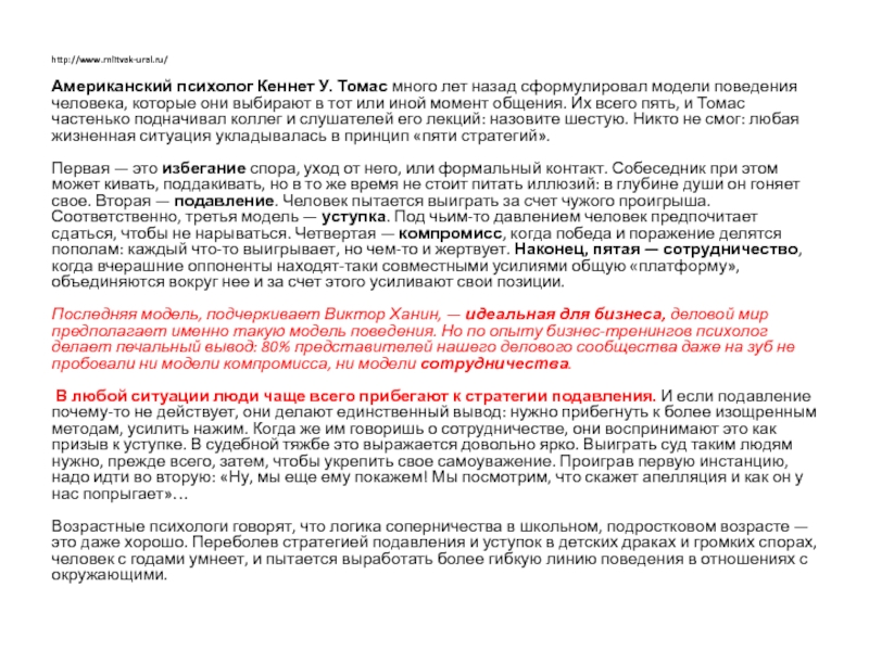 Американский психолог Кеннет У. Томас много лет назад сформулировал модели поведения человека,