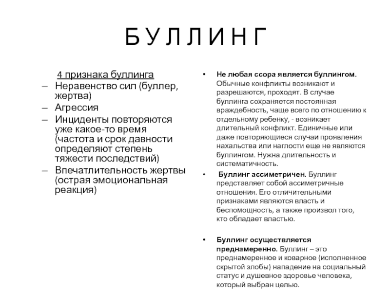 Буллинг ассиметричен. Буллинг представляет собой ассиметричные отношения. Его отличительными признаками являются власть и беспомощность, а также произвол того, кто обладает властью.