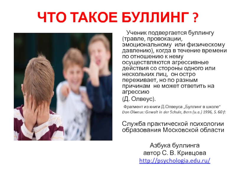 или физическому давлению), когда в течение времени по отношению к нему осуществляются агрессивные действия со стороны одного или нескольких лиц, он остро переживает, но по разным причинам не может ответить на агрессию