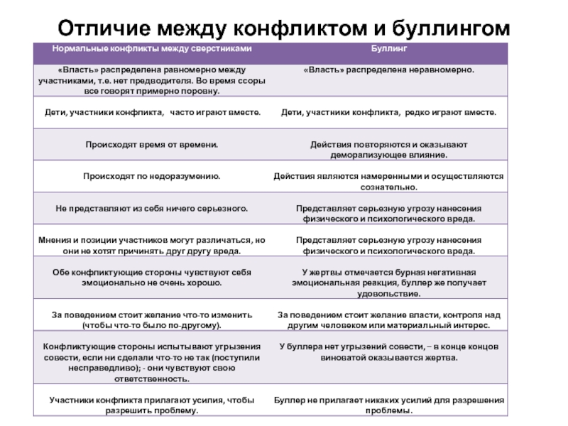Не любая ссора является буллингом. Обычные конфликты возникают и разрешаются, проходят. В случае буллинга сохраняется постоянная враждебность, чаще всего по отношению к отдельному ребенку, - возникает длительный конфликт. Единичные или даже повторяющиеся случаи проявления нахальства или наглости еще не являются буллингом. Нужна длительность и систематичность.