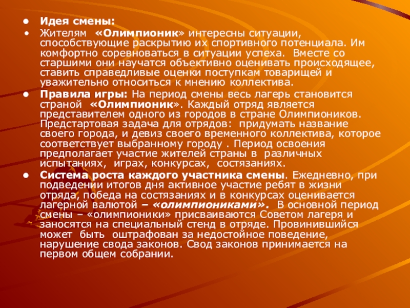 Правила игры: На период смены весь лагерь становится страной «Олимпионик». Каждый отряд является представителем одного из городов в стране Олимпиоников. Предстартовая задача для отрядов: придумать название своего города, и девиз своего временного коллектива, которое соответствует выбранному городу . Период освоения предполагает участие жителей страны в различных испытаниях, играх, конкурсах, состязаниях.