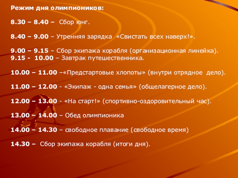 Режим дня олимпиоников:8.30 – 8.40 – Сбор юнг.8.40 – 9.00 – Утренняя зарядка «Свистать всех наверх!».9.00 –