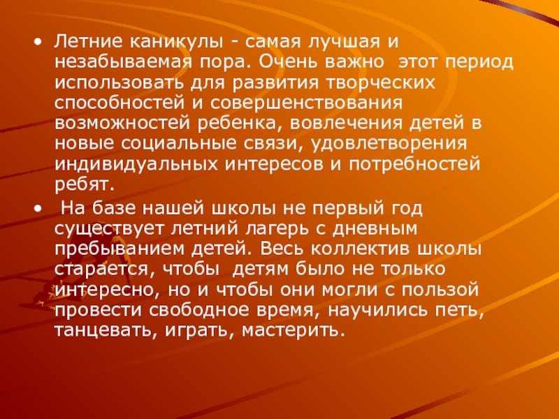 Слайд 2Летние каникулы - самая лучшая и незабываемая пора. Очень важно этот