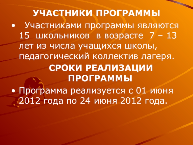 УЧАСТНИКИ ПРОГРАММЫ Участниками программы являются 15 школьников в возрасте 7 – 13 лет из числа учащихся школы,