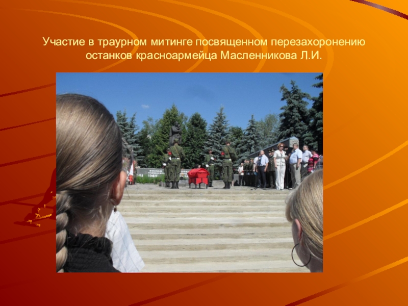 Слайд 11Участие в траурном митинге посвященном перезахоронению останков красноармейца Масленникова Л.И.