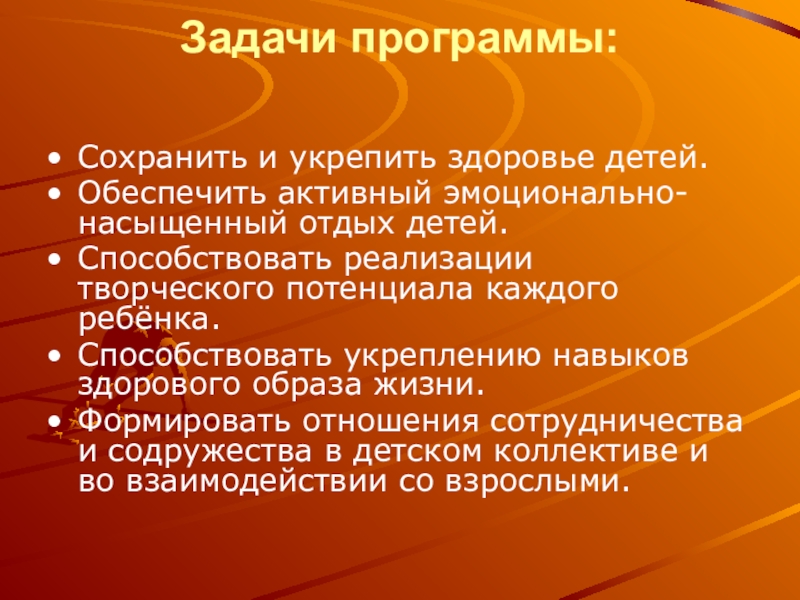 Задачи программы: Сохранить и укрепить здоровье детей.Обеспечить активный эмоционально-насыщенный отдых детей.Способствовать реализации творческого потенциала каждого ребёнка.Способствовать укреплению