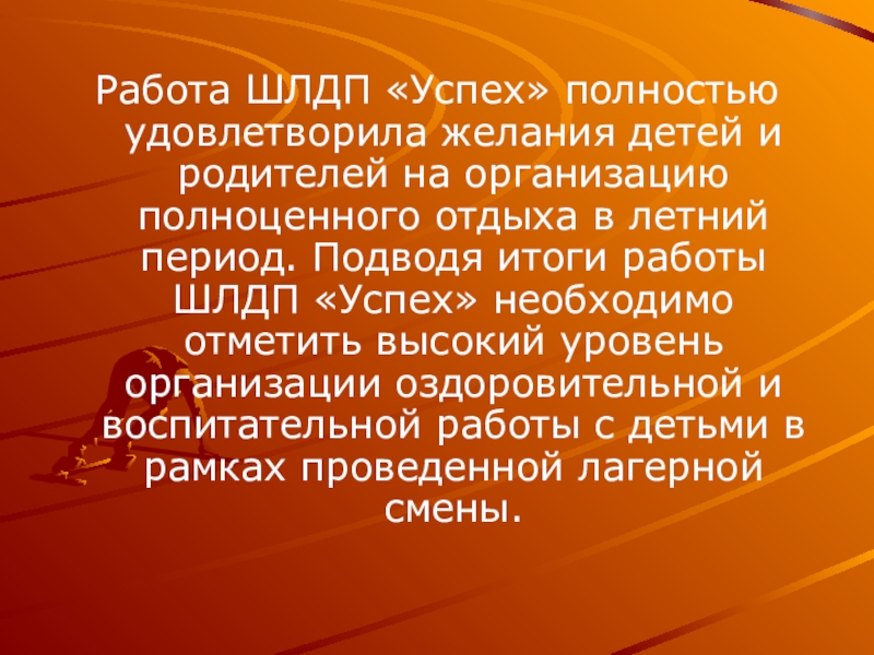 Слайд 17Работа ШЛДП «Успех» полностью удовлетворила желания детей и родителей на организацию