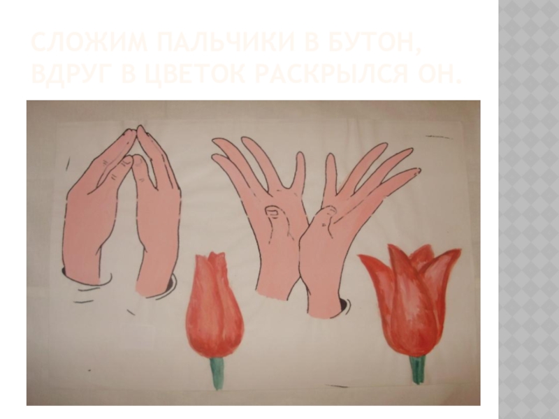 Слайд 19Сложим пальчики в бутон, вдруг в цветок раскрылся он.