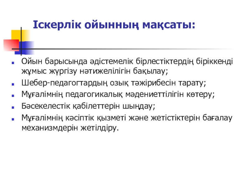 Іскерлік ойынның мақсаты:Ойын барысында әдістемелік бірлестіктердің біріккенді жұмыс жүргізу нәтижелілігін бақылау;Шебер-педагогтардың озық тәжірибесін