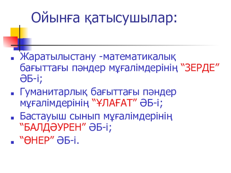 Ойынға қатысушылар:Жаратылыстану -математикалық бағыттағы пәндер мұғалімдерінің “ЗЕРДЕ” ӘБ-і;Гуманитарлық бағыттағы пәндер мұғалімдерінің “ҰЛАҒАТ” ӘБ-і;Бастауыш сынып мұғалімдерінің “БАЛДӘУРЕН” ӘБ-і;“ӨНЕР”