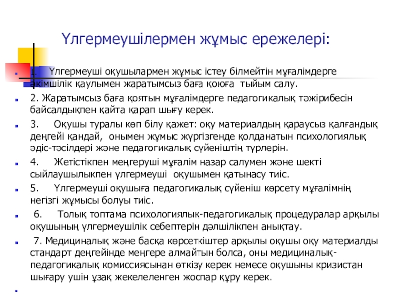 4. Жетістікпен меңгеруші мұғалім назар салумен және шекті сыйлаушылыкпен үлгермеуші оқушымен қатынасу тиіс.