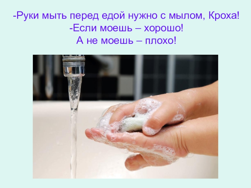 Слайд 6-Руки мыть перед едой нужно с мылом, Кроха! -Если моешь – хорошо! А