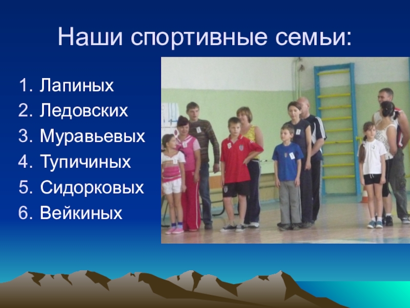 Наши спортивные семьи:ЛапиныхЛедовскихМуравьевыхТупичиныхСидорковыхВейкиных