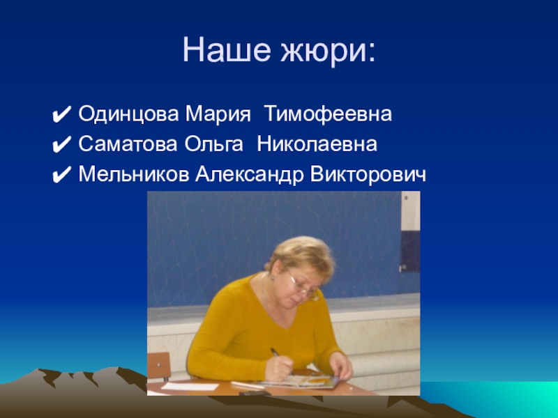 Наше жюри:Одинцова Мария ТимофеевнаСаматова Ольга НиколаевнаМельников Александр Викторович