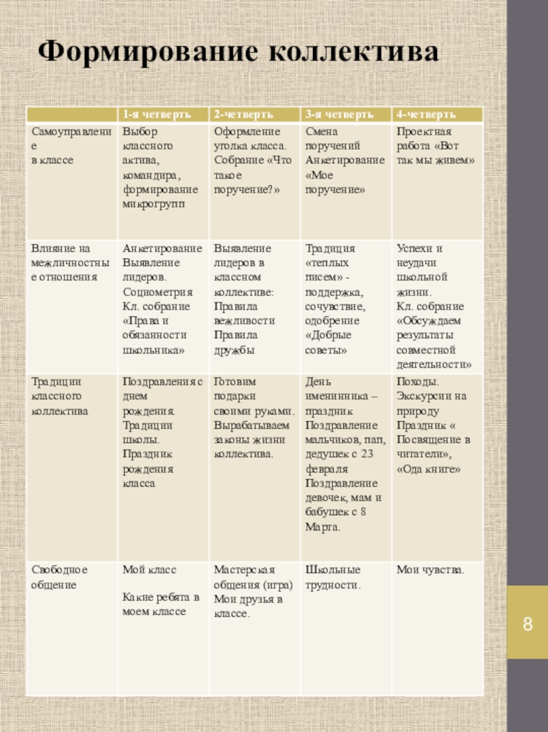 Вся работа классного руководителя направлена на воспитание чувства коллективизма, создание благоприятной атмосферы на уроках и во внеурочное время.