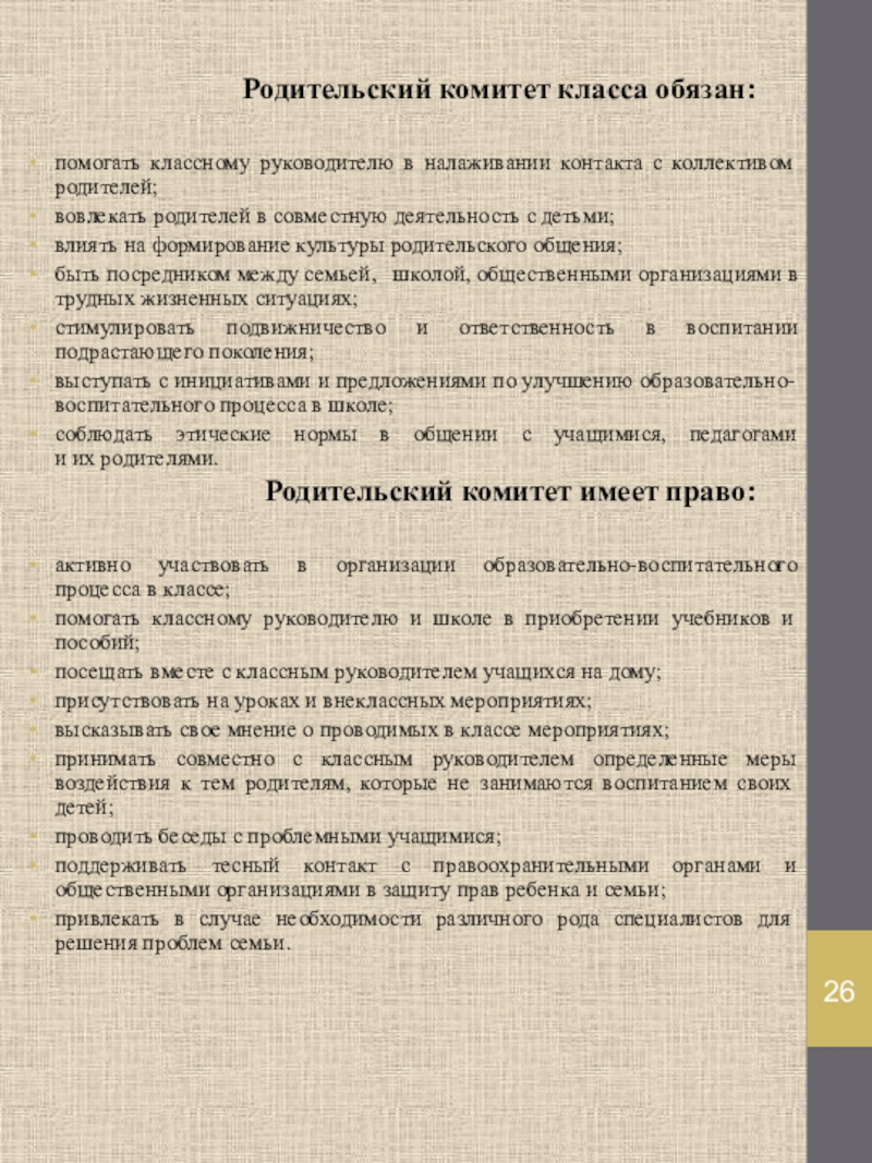 помогать классному руководителю в налаживании контакта с коллективом родителей;