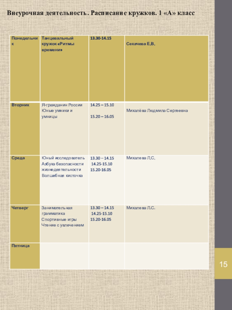 Слайд 15Внеурочная деятельность. Расписание кружков. 1 «А» класс