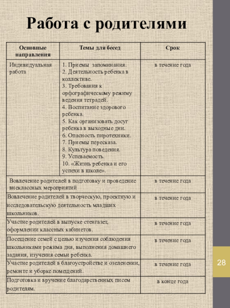 Родители активно посещают родительские собрания, интересуются успехами своих детей, оказывают необходимую помощь в учебе детям, в ремонте и уборке класса, в проведении внеклассных мероприятий. Создан родительский комитет в составе 3 человек.