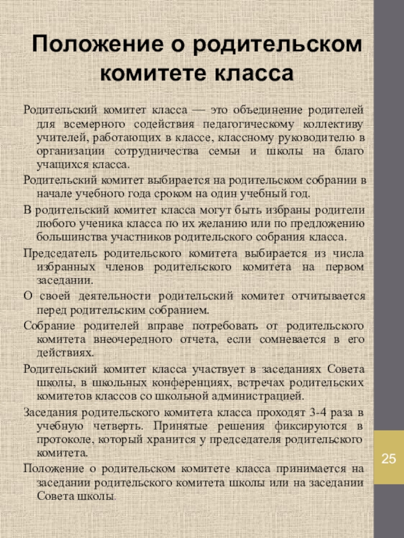 Положение о родительском комитете класса принимается на заседании родительского комитета школы или на заседании Совета школы.