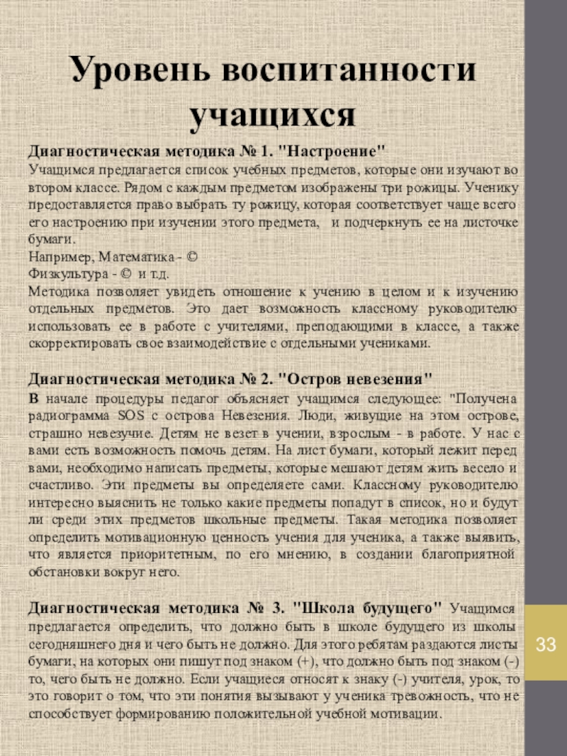 Диагностическая методика № 3. "Школа будущего" Учащимся предлагается определить, что должно быть в школе будущего из школы сегодняшнего дня и чего быть не должно. Для этого ребятам раздаются листы бумаги, на которых они пишут под знаком (+), что должно быть под знаком (-) то, чего быть не должно. Если учащиеся относят к знаку (-) учителя, урок, то это говорит о том, что эти понятия вызывают у ученика тревожность, что не способствует формированию положительной учебной мотивации.