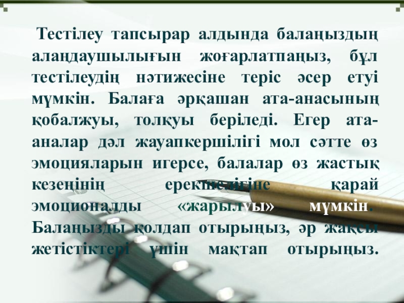 Слайд 6 Тестілеу тапсырар алдында балаңыздың алаңдаушылығын жоғарлатпаңыз, бұл тестілеудің нәтижесіне теріс әсер