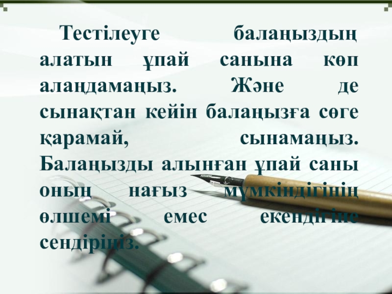 Слайд 5 Тестілеуге балаңыздың алатын ұпай санына көп алаңдамаңыз. Және де сынақтан кейін