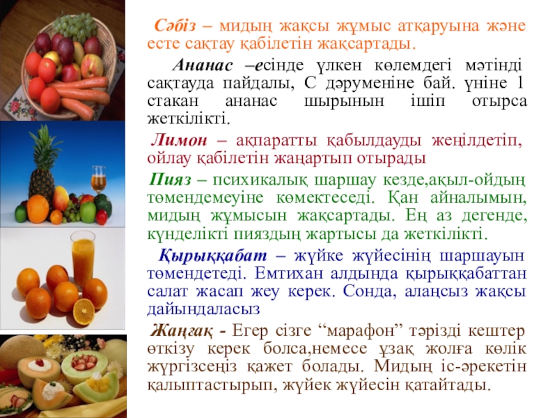 беріледі.Қарқынды ақыл – ой жұмысауы кезінде дәрумендерге бай тағамдар жеу қажет.Мысалға, балық, ірімшік, жаңғақ,кепкен өрік(курага) және т.б. бас миы жұмысын белсенді ететін тағамдар жатады.