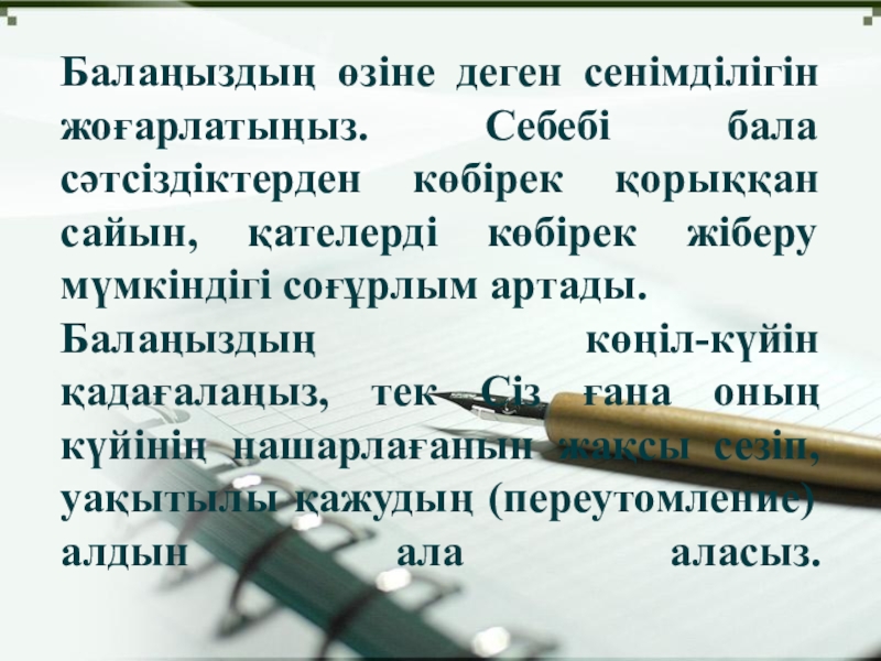 Слайд 7Балаңыздың өзіне деген сенімділігін жоғарлатыңыз. Себебі бала сәтсіздіктерден көбірек қорыққан сайын,