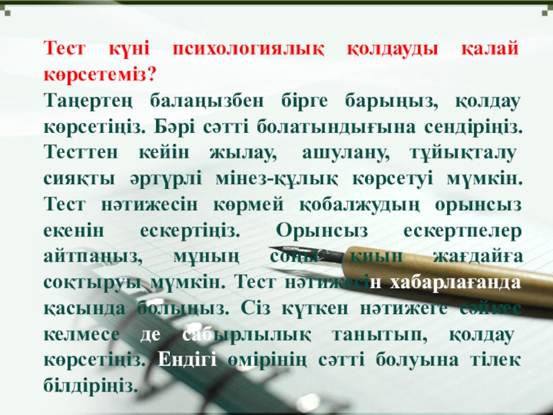 Слайд 11Тест күні психологиялық қолдауды қалай көрсетеміз?
