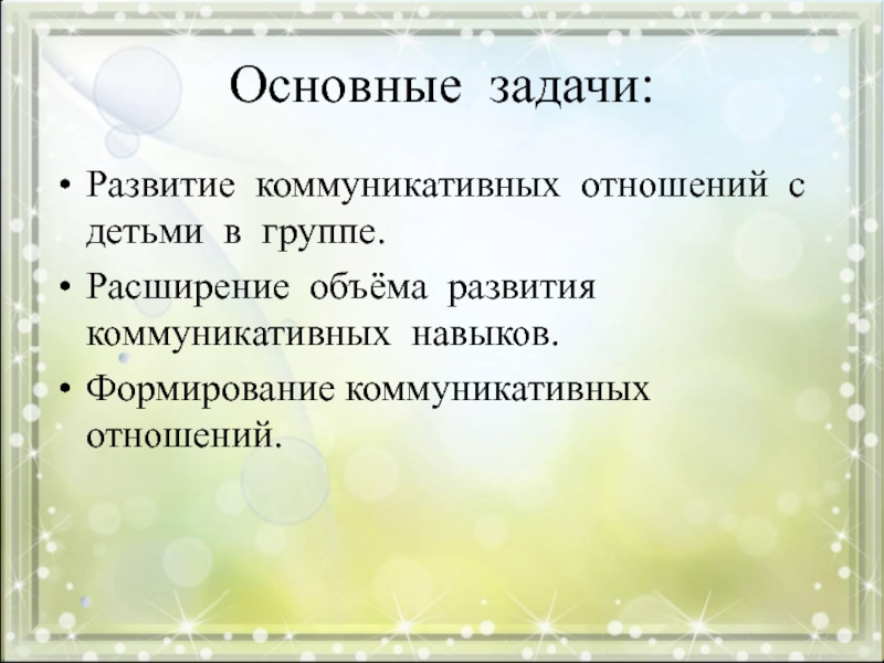 Основные задачи:Развитие коммуникативных отношений с детьми в группе.Расширение объёма развития коммуникативных навыков.Формирование коммуникативных отношений.
