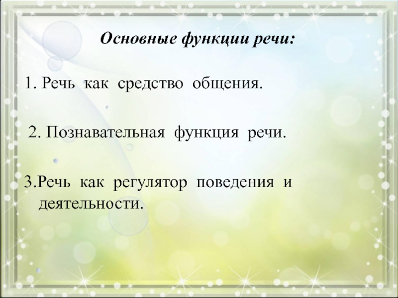 Основные функции речи: 1. Речь как средство общения.  2. Познавательная функция речи.3.Речь как регулятор поведения и