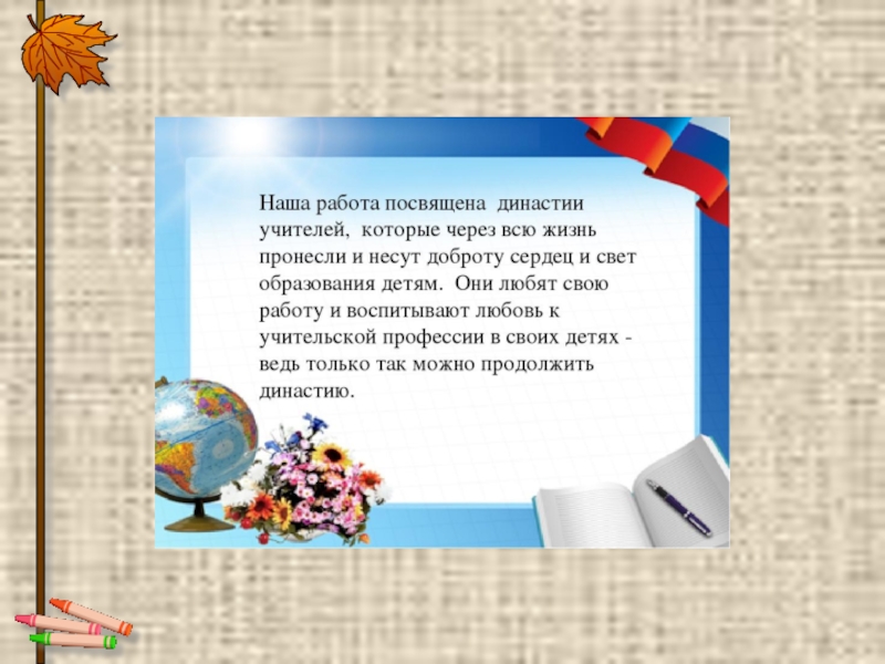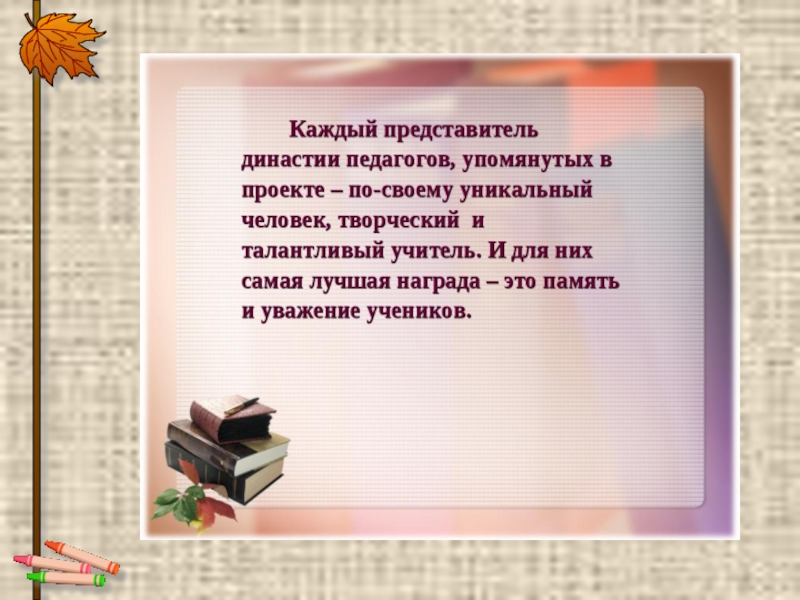 Я благодарна своим родным людям за то, что они на протяжении долгих лет показывали мне пример любви к детям и к своей профессии. Профессии есть разные, но я убеждена: самая добрая и мудрая профессия на земле - это учитель. С гордостью могу добавить, что общий педагогический стаж нашей семьи 121 год.