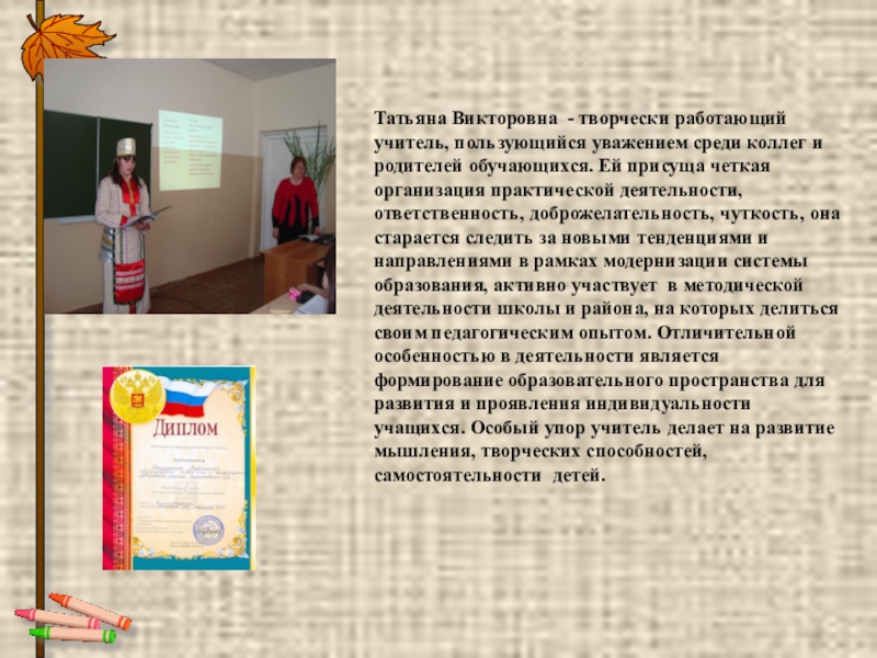Слайд 23Татьяна Викторовна - творчески работающий учитель, пользующийся уважением среди коллег и