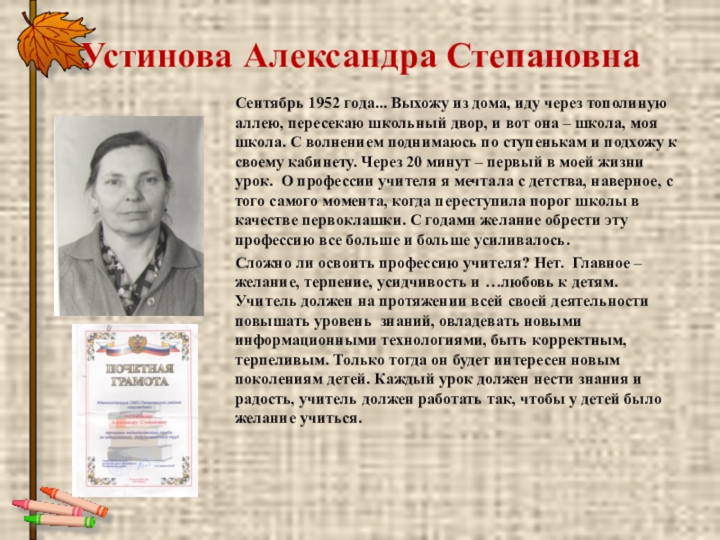 школьный двор, и вот она – школа, моя школа. С волнением поднимаюсь по ступенькам и подхожу к своему кабинету. Через 20 минут – первый в моей жизни урок. О профессии учителя я мечтала с детства, наверное, с того самого момента, когда переступила порог школы в качестве первоклашки. С годами желание обрести эту профессию все больше и больше усиливалось.