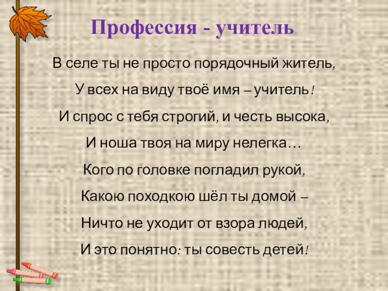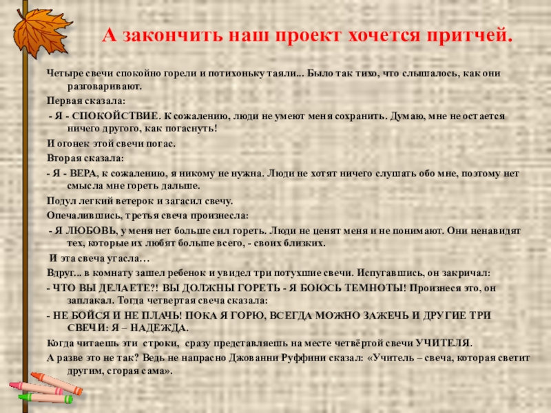 А разве это не так? Ведь не напрасно Джованни Руффини сказал: «Учитель – свеча, которая светит другим, сгорая сама».