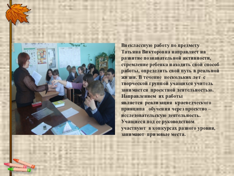 Внеклассную работу по предмету Татьяна Викторовна направляет на развитие познавательной активности,