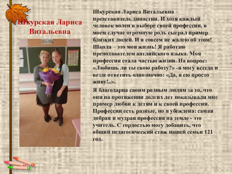 Шкурская Лариса Витальевна – представитель династии. И хотя каждый