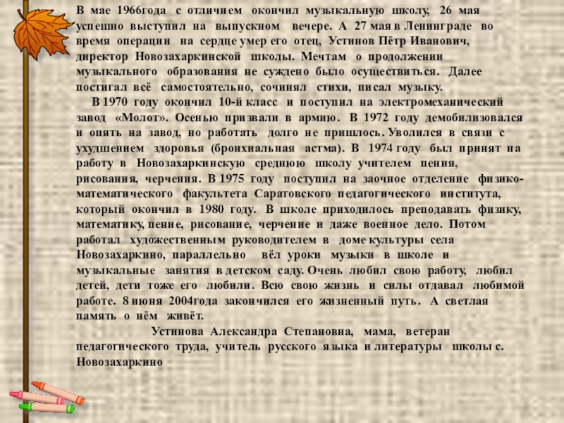 Слайд 17В мае 1966года с отличием окончил музыкальную школу,