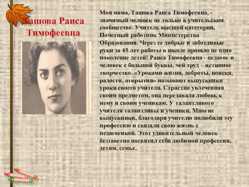 Моя мама, Ташова Раиса Тимофеевна, - значимый человек не