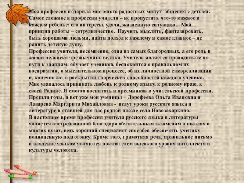 человек волен в выборе своей профессии, в моем случае огромную роль сыграл пример близких людей. И я совсем не жалею об этом! Школа – это моя жизнь! Я работаю преподавателем английского языка. Моя профессия стала частью жизни. На вопрос: «Любишь ли ты свою работу?» -я могу всегда и везде ответить однозначно: «Да, я ею просто живу!..».