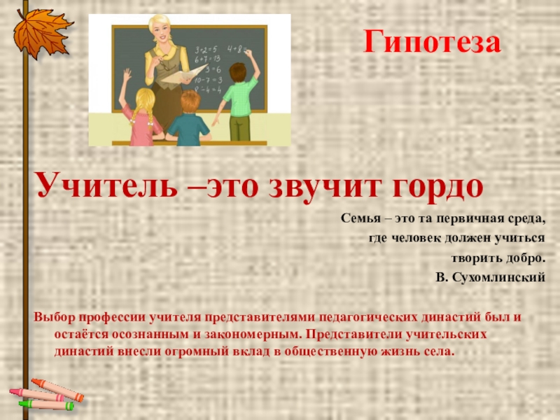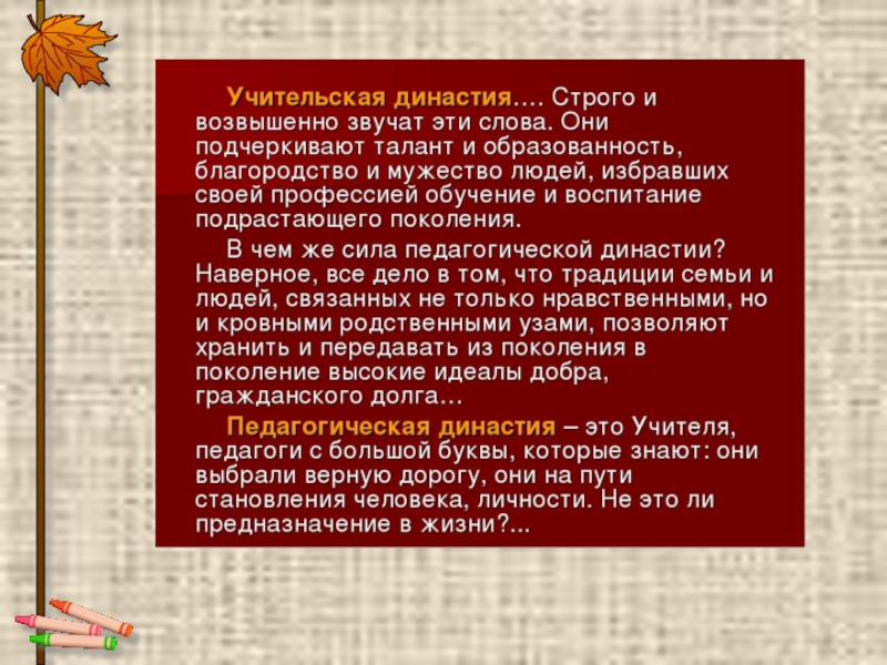 Выбор профессии учителя представителями педагогических династий был и остаётся осознанным и закономерным. Представители учительских династий внесли огромный вклад в общественную жизнь села.