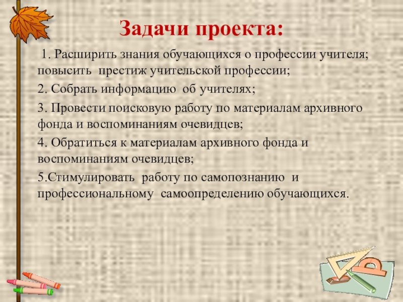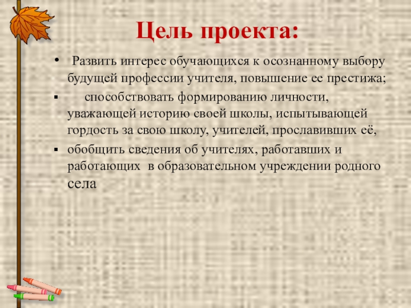 1. Расширить знания обучающихся о профессии учителя; повысить престиж