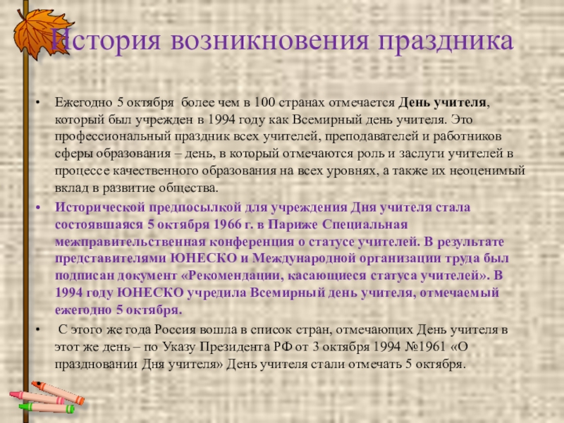 С этого же года Россия вошла в список стран, отмечающих День учителя в этот же день – по Указу Президента РФ от 3 октября 1994 №1961 «О праздновании Дня учителя» День учителя стали отмечать 5 октября.